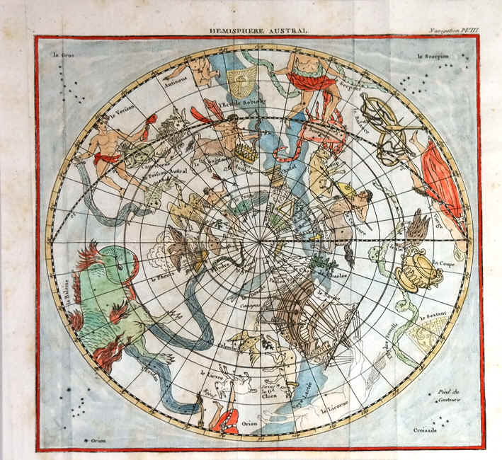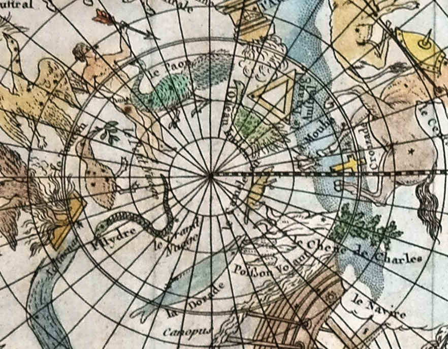 Soltanto alcuni astri tra quelli più luminosi riportano il loro nome proprio (Sirius, Canopus, Arcturus, Rigel, Achernar, Fomalhaut). Le costellazioni sono invece nominate in lingua francese e sono presenti, oltre a quelle di origine tolemaica, anche quasi tutte quelle ideate fino all’epoca di produzione della carta, molte delle quali attualmente non più utilizzate: Nell’emisfero boreale: le Mont Menale, Antinous, le Renard, la Chevelure de Berenice, les Levriers, le Petit Lion, la Linx, le Sextant, la Reenne, la Giraffe, la Licorne, la Mouche, la Téte de Meduse, le Petite Triangle, la Chevre e nell’emisfero meridionale: ancora Antinous, la Licorne e le Sextant, quindi l’Ecude de Sobiecky, le Toucan, le Paon, l’Ouseau Indien, le Triangle Austral, la Mouche, le Cameleon, la Colombe, la Croisade, le Phenix, le Poisson Volant, la Chene de Charles, la Dorade, l’Hydre (Hydrus), la Petite Nuage , la Grande Nuage ed infine Indus e Grus (soltanto disegnati ma senza nome).