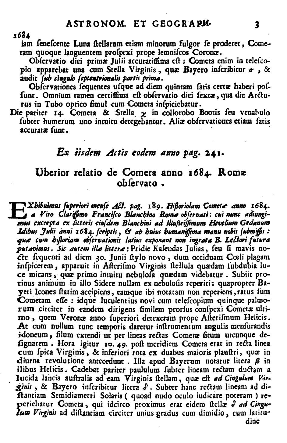COMETES Anno 1684 MENSE JUNIO Julioque Romae observatus, UBERIOR RELATIO DE COMETA… in ACTA ERUDITORUM, Lipsia 1685 |