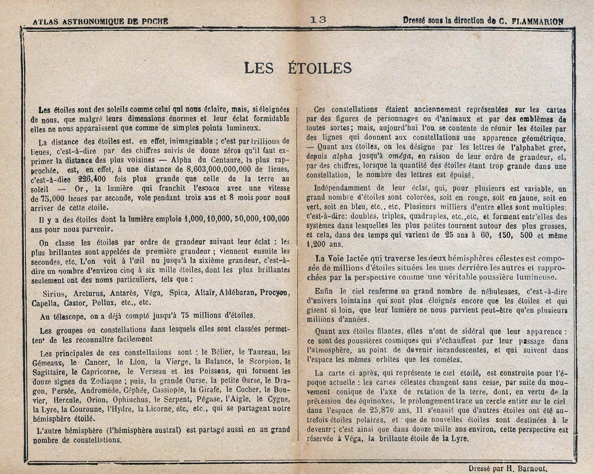 Nella prima tavola del nuovo atlante Flammarion e Barnaut ci rendono edotti dei criteri utilizzati per proporre in un unico volume di 18 tavole, delle quali 5 di testi esplicativi, l’opera precedente del 1875: “L’Atlas astronomique de poche a d’abord été publié en deux parties distinctes et complémentaires. – Nous les réunisson aujourd’hui en une seule, en rétablissant dans leur sucession méthodique l’ordre des planches, qui constituent ainsi, par leur ensemble, un Traité complet d’Astronomie populaire.”.