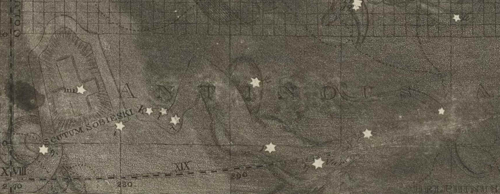 Oltre alle costellazioni di origine tolemaica trovano posto nella tavola Norma , Microscopium e Telescopium ideate da Lacaille, Scutum (Sobieski), Sextans, Lynx e Leo Minor di Hevelius, Grus di Bayer, Monoceros di Habrecht II, Bartsch e Plancius e quelle ora non più contemplate di Caput Medusae, Musca Borealis e Antinous.