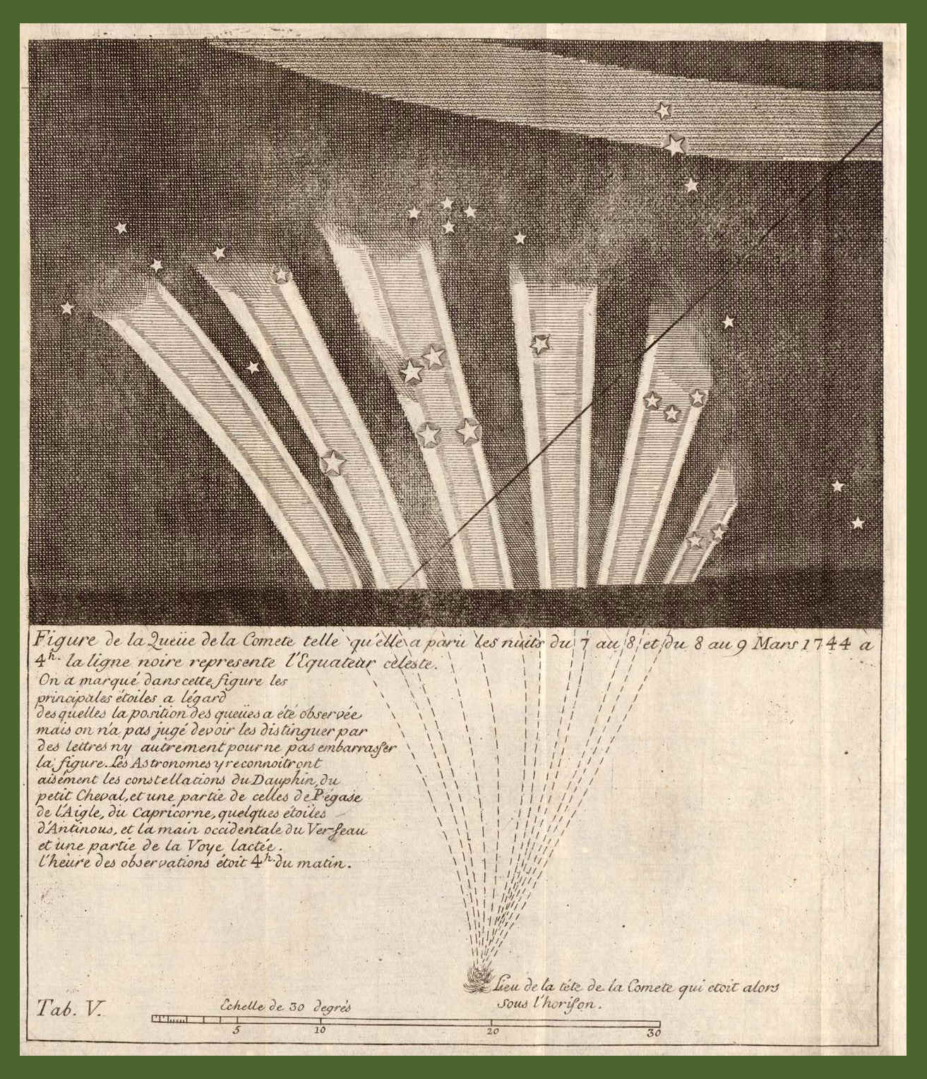 La coda della cometa tra il 7 ed il 9 marzo 1744. La posizione della testa, sotto all'orizzonte, è determinata proiettando idealmente le curve delle parti visibili. L'autore spiega nella didascalia di aver ritenuto di non riportare il nome delle stelle e delle costellazioni visibili per non affollare e disturbare l'immagine e le elenca: Dauphin, Petit Cheval, Pégase, Aigle, Capricorne, Antinous, la maine occidentale du Versau. In alto è tracciata la parte visibile della Voye Lactée, la linea nera che attraversa la carta è la proiezione dell'equatore. L'osservazione è delle ore 4 del mattino.