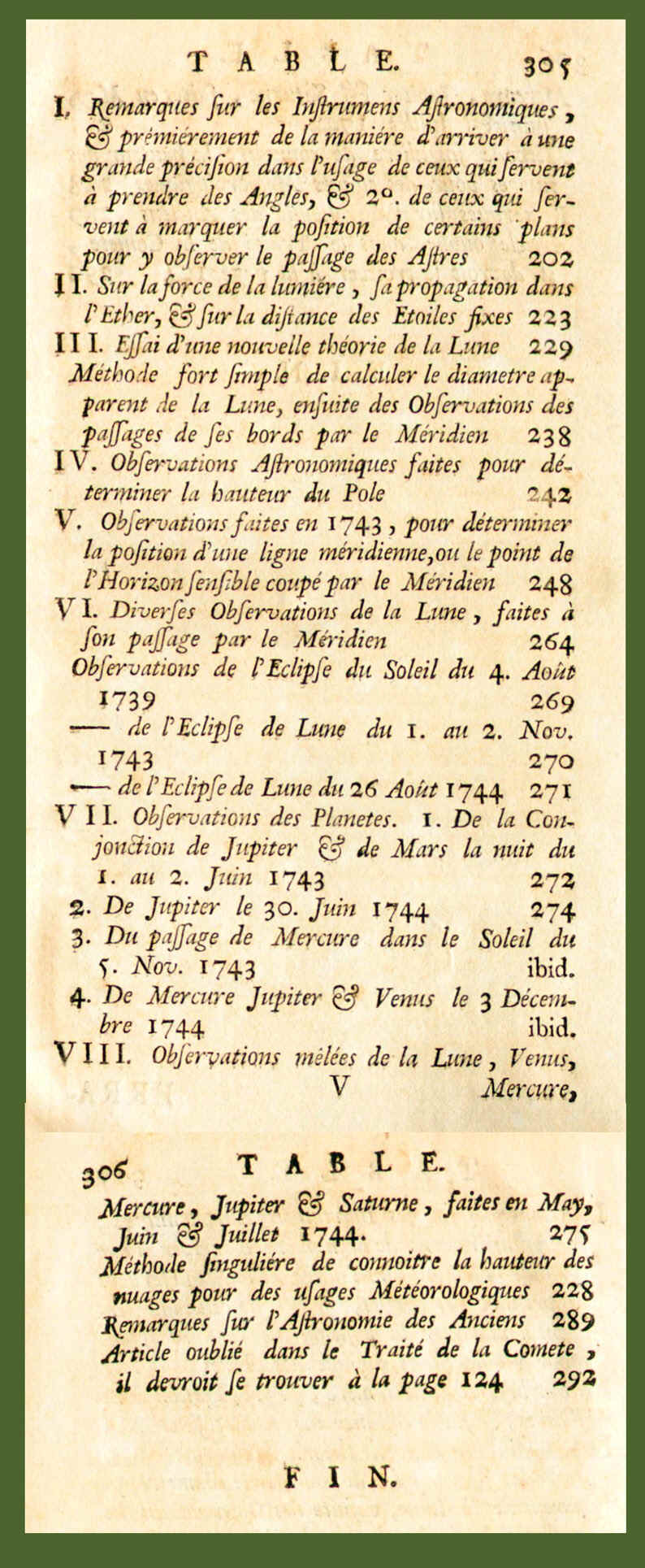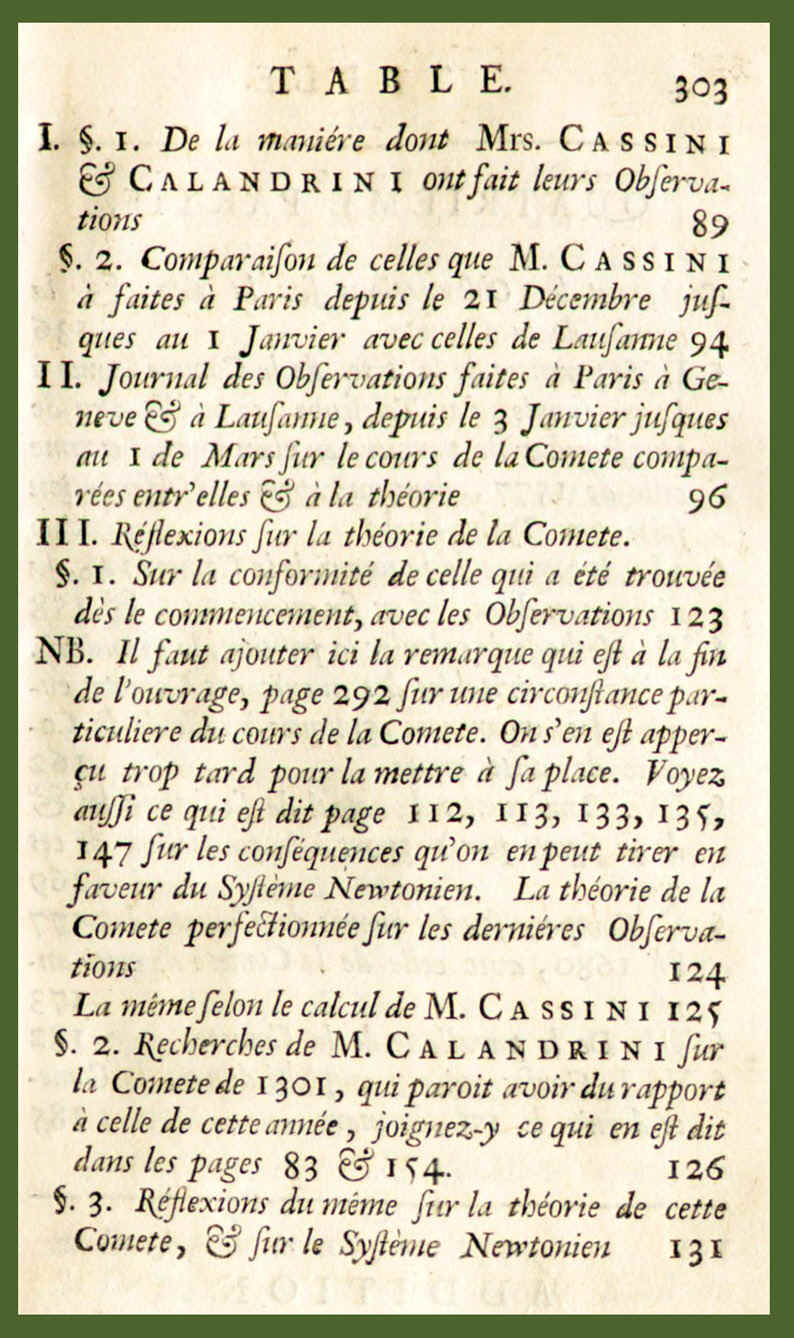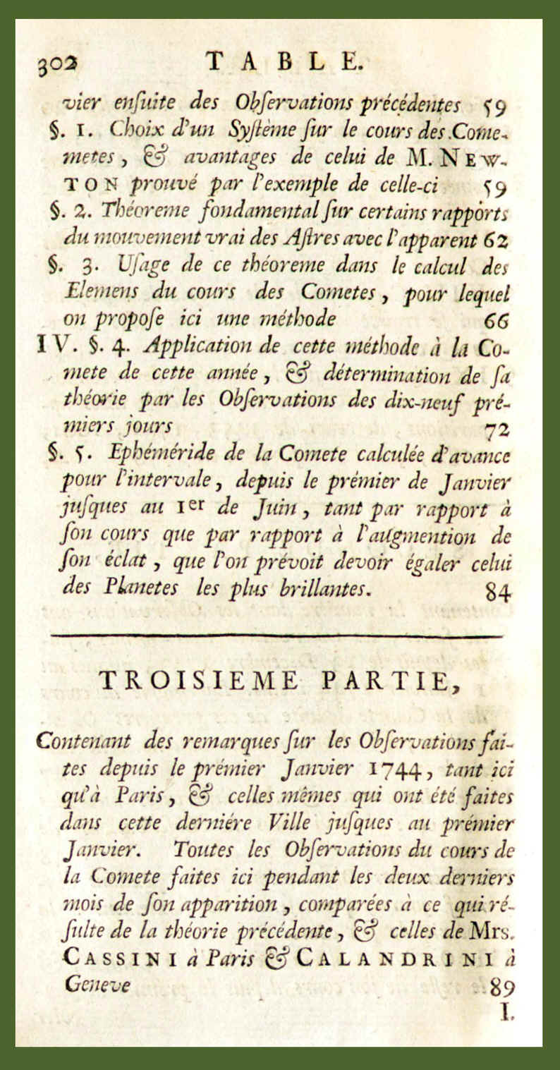 Percorso della cometa per il 1743 e 1744 costruito dall'autore sulla scorta dei dati raccolti nelle osservazioni realizzate in 19 diversi giorni. Per alcuni giorni è stato poi aggiunto il disegno della forma e delle dimensioni apparenti della cometa. La zona di cielo è rappresentata in proiezione polare eclittica concava, le stelle sono identificate con lettere greche secondo la classificazione di Bayer, le costellazioni riportano il nome in francese, tra queste è inclusa quella non tolemaica di Antinous, è riportata la Nebuleuse di Andromeda. Il reticolo di riferimento è quello eclittico comprensivo di Eclittica e linee di longitudine. E' tracciata anche la proiezione dell'equatore e del cerchio di meridiano passante per il luogo di osservazione, Losanna.