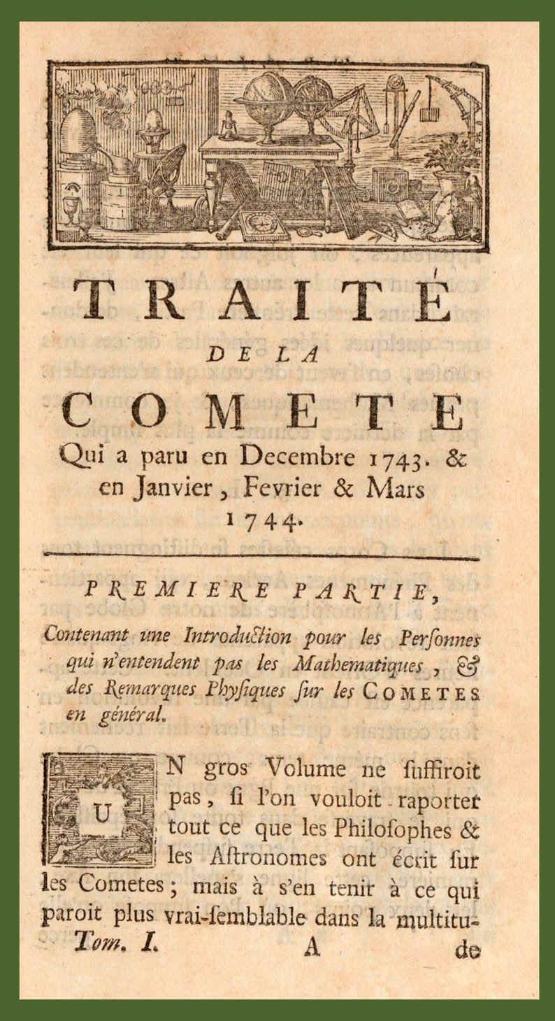 La Grande cometa del 1744, spettacolare per la complessità della coda e talmente luminosa da poter essere osservata anche di giorno, scoperta da diversi osservatori indipendenti (Jan de Munck il 29 novembre 1743, Klinkenberg il 9 dicembre e Chéseaux il 13 dicembre) ci viene proposta da quest’ultimo autore nel suo ampio saggio Traité de la comète, pubblicato a Losanna il 1744. Nel trattato, oltre ad esaminare l’orbita della cometa applicando la legge gravitazionale di Newton, l’autore tratta e anticipa quello che passerà alla storia dell’astronomia come il Paradosso di Olbers. Il trattato vero e proprio sulla cometa occupa le prime 187 pagine del libro, le altre, fino alla pagina 299, contengono i contributi dell’autore su diverse parti dell’arte astronomica.