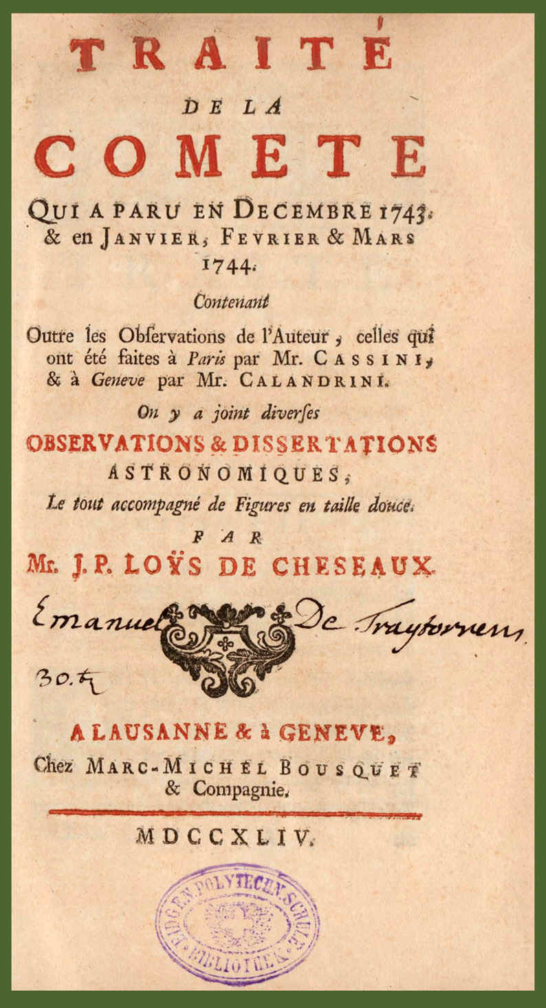 Traité de la comète : qui a paru en décembre 1743 & en janvier, février & mars 1744 / contenant outre les observations de l'auteur, celles qui ont été faites à Paris par Mr. Cassini, & à Genève par Mr. Calandrini; on y a joint diverses observations & dissertations astronomiques; le tout accompagné de figures en taille douce; par J. P. Loÿs de Cheseaux, Lausanne 1744
