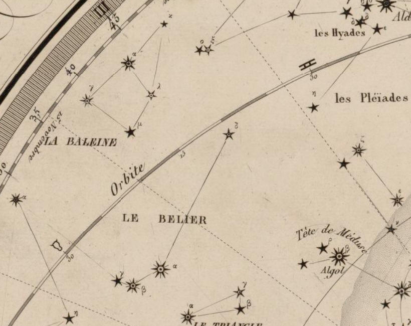 Le costellazioni sono tutte quelle definite all’epoca e ne comprendono alcune attualmente non più utilizzate. Manca, come sempre in Dien, il disegno del personaggio mitologico. Manca anche la curva coincidente con i relativi confini. Si riconoscono dal nome in lingua francese e dal reticolo di segmenti che unisce tra loro le rispettive stelle di appartenenza.
