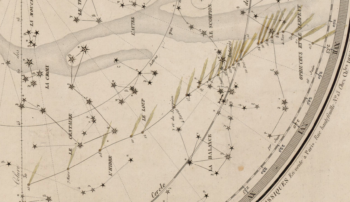 Come è consuetudine nelle tavole di Dien è possibile riferirsi al meridiano celeste di Parigi per tutti i giorni dell’anno, in questa carta alle nove serali: i relativi meridiani sono disegnati ogni quindici giorni come raggi puntinati partenti dal polo equatoriale e raggiungenti la proiezione dell’equatore dove è posta la relativa data.