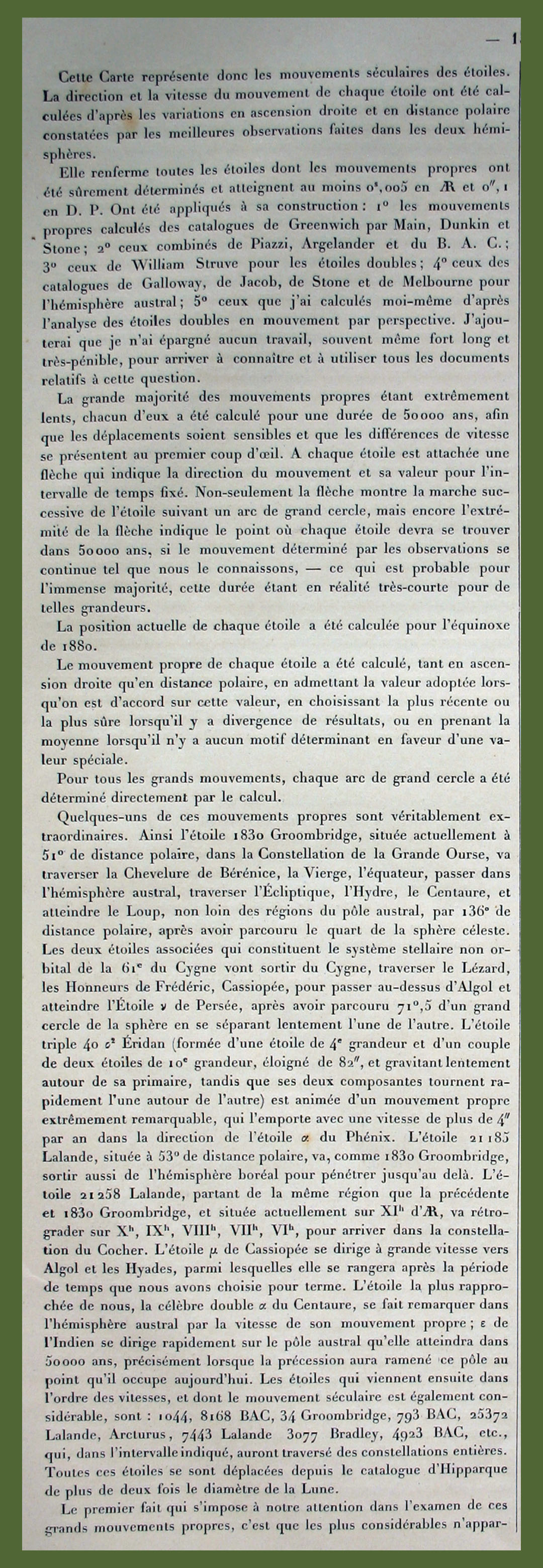 Flammarion descrive nella nota esplicativa relativa alla tavola il metodo di lavoro seguito per la costruzione della stessa, i cataloghi stellari confrontati, e alcune prime conclusioni teoriche del suo lavoro che gli permettono prima di suddividere e poi di associare rispetto al loro moto reale interi sistèmes sidéraux contenenti poi più piccoli sistèmes stellaires tra loro indipendenti.
