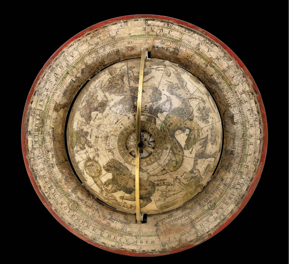 The celestial globe shows the constellations drawn as figures over their star