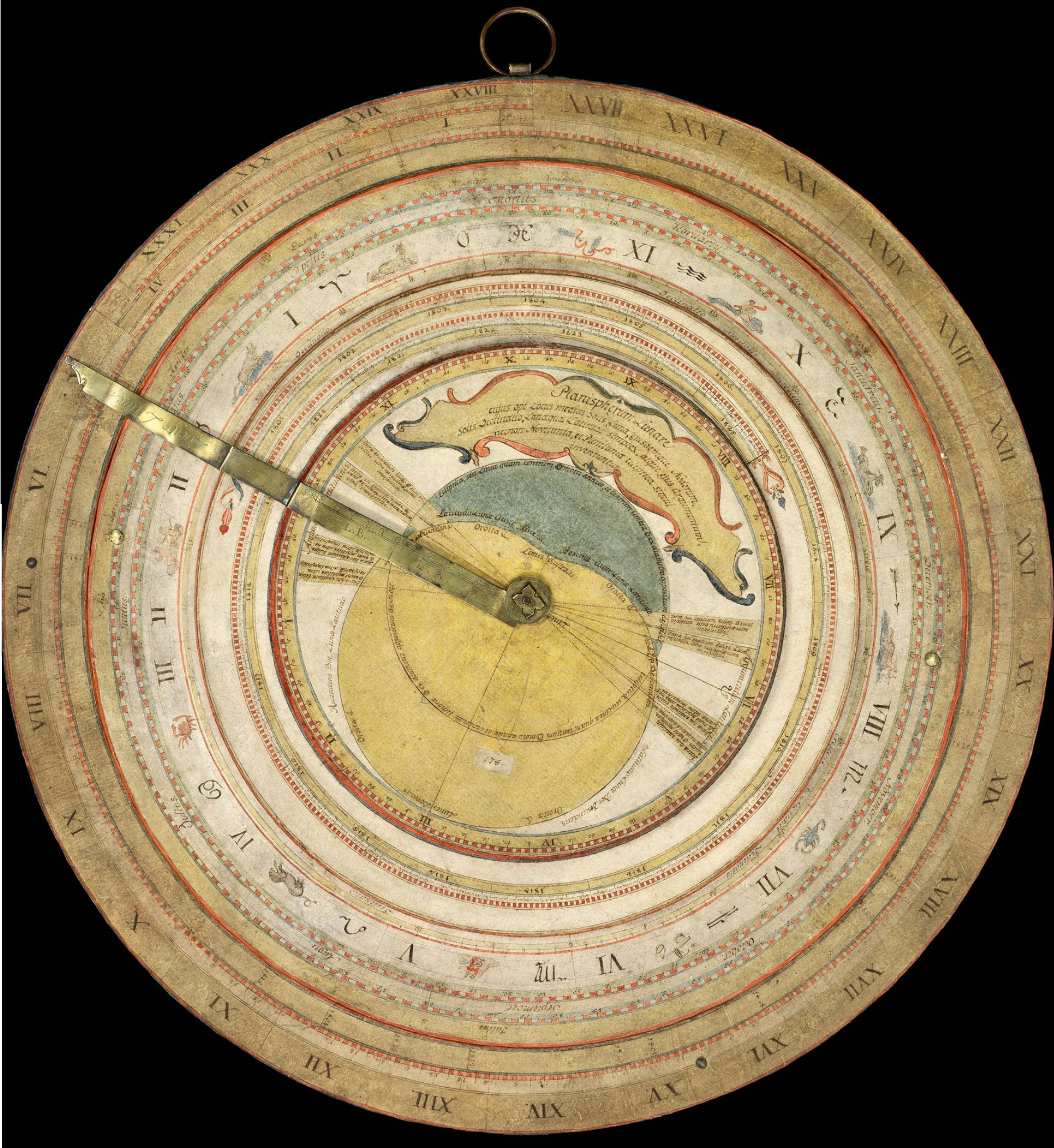 Ink and polychromy on paper over pine. The instrument comprises a circular base plate, and three rotatable cardboard volvelles, and a brass radius pointer, attached to each other in the centre. A brass ring is attached to the base plate for suspending. All four paper covered discs are finely inscribed in manuscript with various scales and symbols.