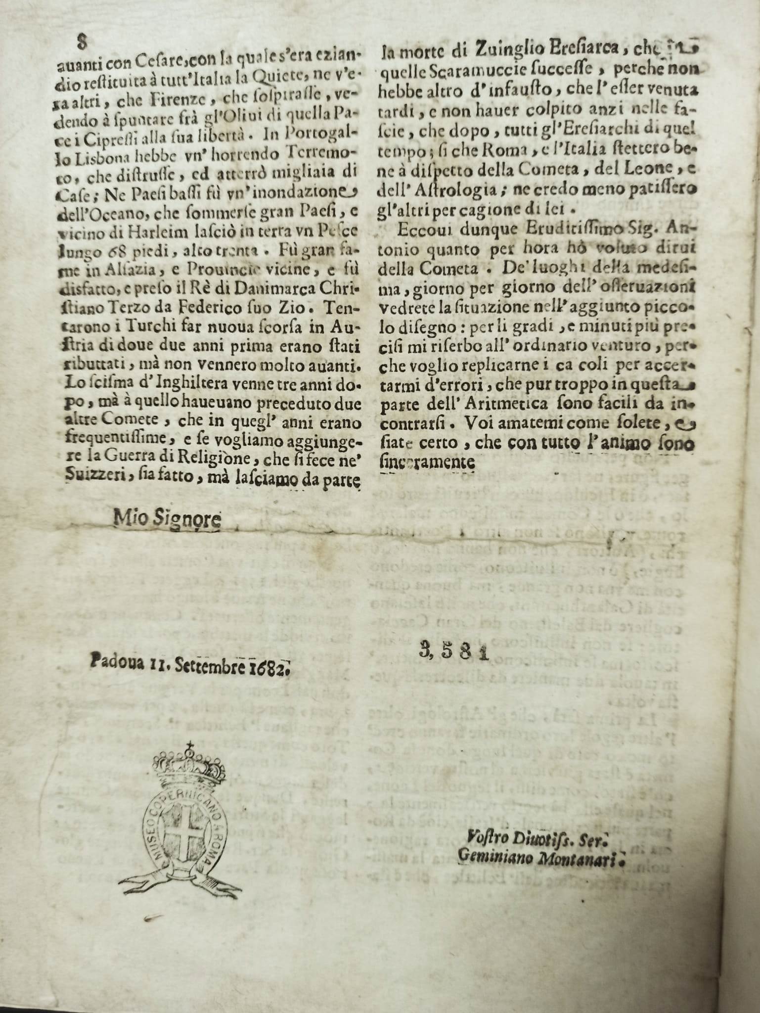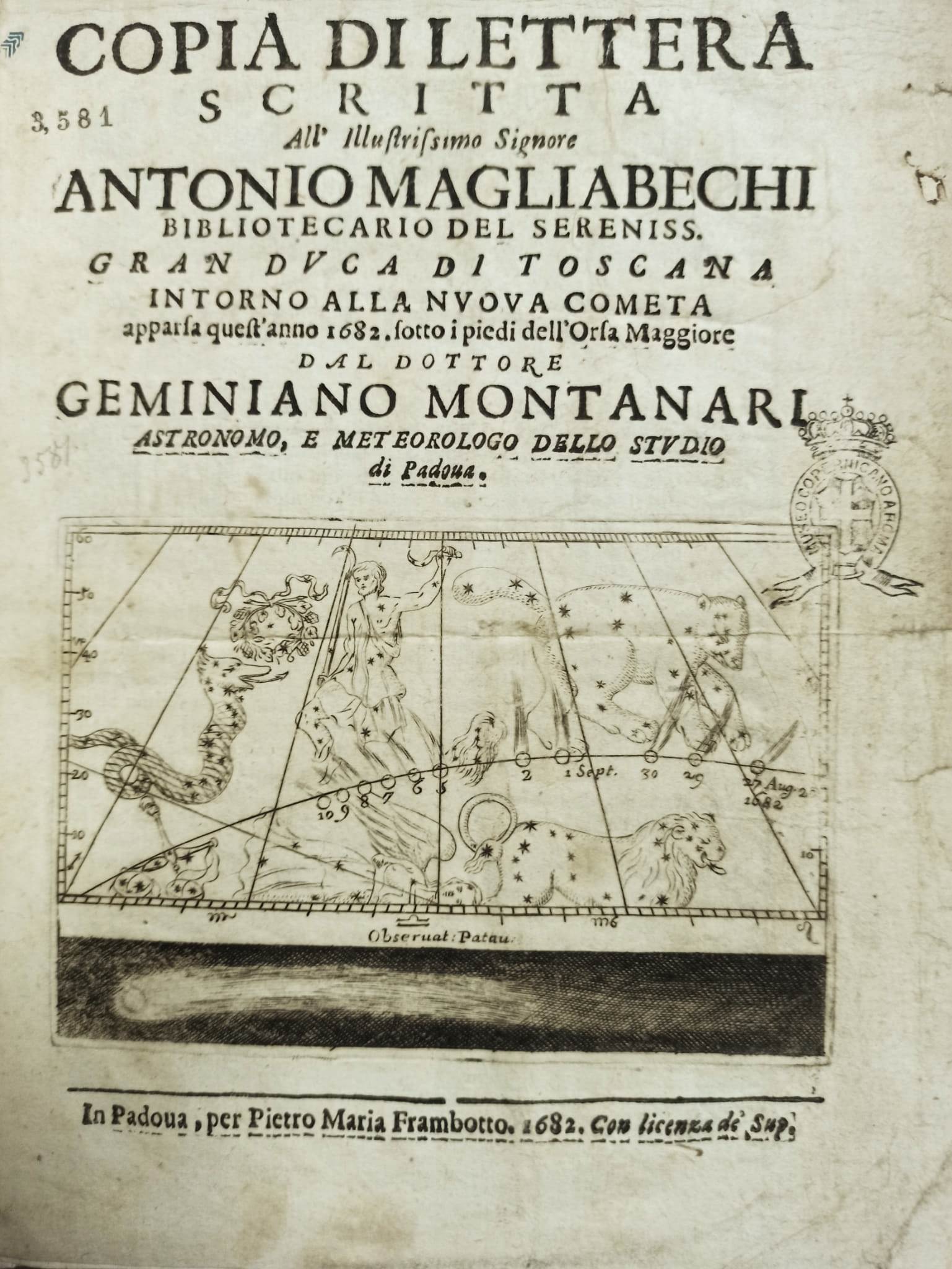 La copertina della  lettera è completata da una carta in proiezione eclittica concava dove il  tragitto della cometa viene costruito per interpolazione delle undici distinte  osservazioni effettuate a Padova da Montanari dal 27 agosto al 10 settembre del 1682.