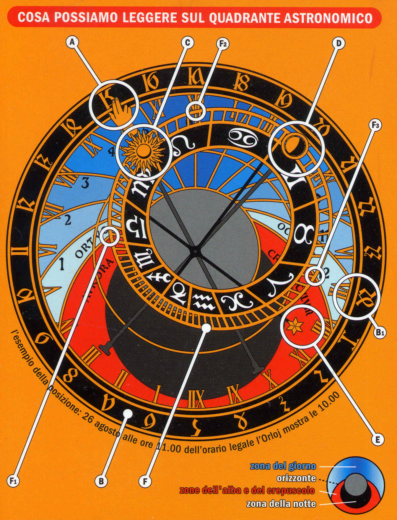 L’orologio rappresenta pertanto la proiezione stereografica del globo celeste, privo di stelle ma comprensivo dell’orbita della Luna e del Sole intorno al centro occupato dalla Terra, la visione è pertanto precopernicana. La proiezione ha come punto di partenza il Polo nord celeste ed è costruita per l’orizzonte di Praga.