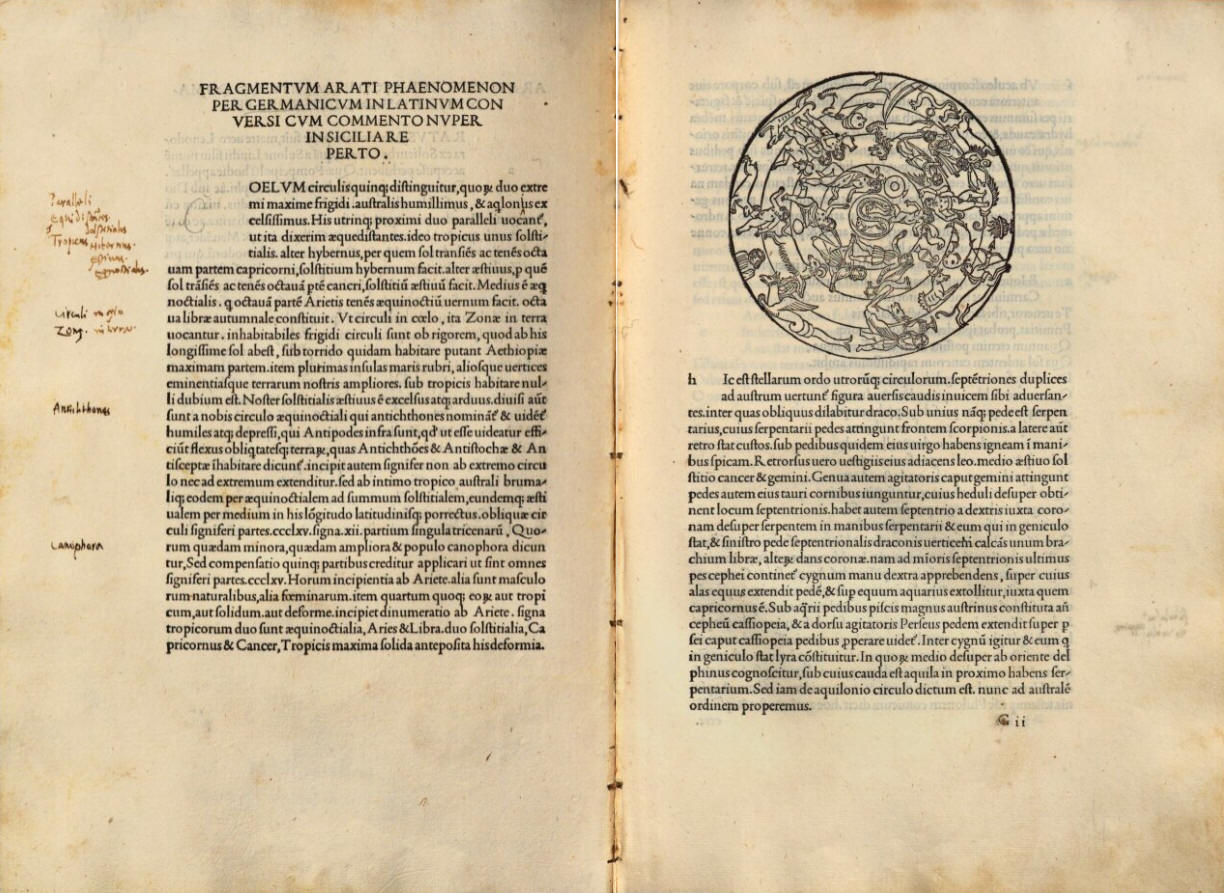 Fragmentum Arati Phaenomenon per Germanicum in Latinum conversi cum commento nuper in siciliare perto. in The Scriptores astronomici veteres Julius Firmicus Maternus, Mathesis (De nativitatibus libri VIII). Ed: Franciscus Niger. Add: Marcus Manilius: Astronomicorum libri V. Aratus: Phaenomena [Latin and Greek]. Tr & adapt: Germanicus Caesar, Marcus Tullius Cicero, Rufius Festus Avienus. Theon: Commentaria in Aratum [Greek]. Pseudo- Proclus Diadochus [i.e. Geminos]: Sphaera [Greek and Latin]. Tr: Thomas Linacrus, presso Aldus Manutius, Venezia 1499
