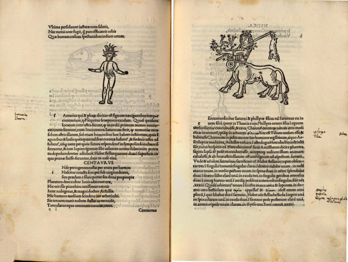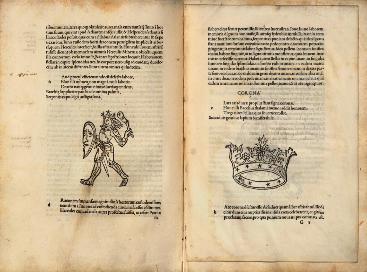 Aldo Manuzio riutilizza in questo caso le immagini utilizzate da Antonius de Strata nel 1488 per illustrare l’edizione di Arati Phaenomena operata da Rufus Restus Avienus (seconda metà IV sec. D. C.), testo nel quale l’editore presenta la novità del planisfero celeste inciso ex novo da un autore anonimo e le singole costellazioni che ricava identiche dall’edizione del Poeticon Astronomicon di Hyginus curato da Arhard Ratdolt, Venezia 1485, (http://www.atlascoelestis.com/Arh%20Pagina.htm ) presentando però tutte le tavole ribaltate di 180° sul loro asse verticale. ( rif.: Deborah J. Warner, The Sky Explored, Celestial Cartography 1500-1800, pag 270)
