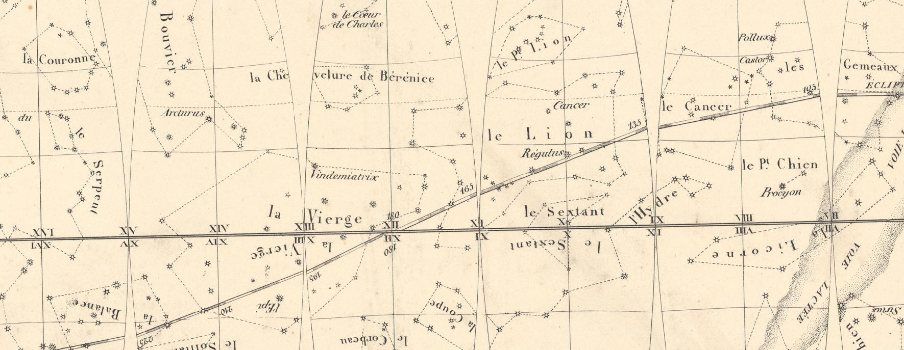 Le costellazioni, quasi tutte quelle ideate fino all’epoca, sono nominate in francese e riconoscibili dalla figura composta dall’ insieme dei segmenti che uniscono le loro stelle periferiche. Manca il disegno del personaggio mitologico e la curva delimitante i confini.