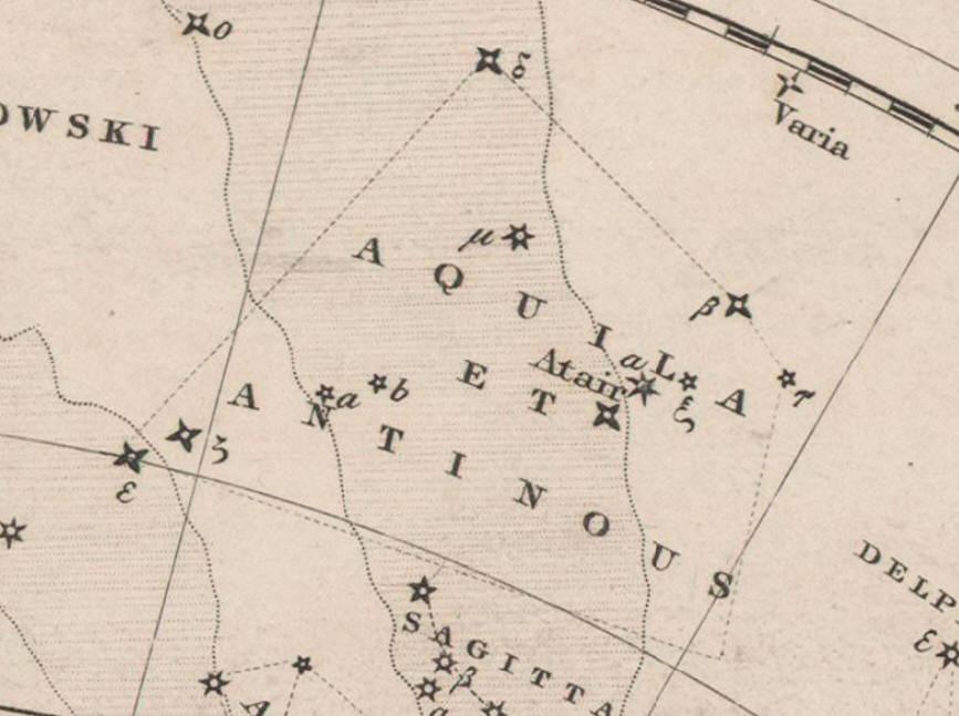 Le costellazioni riportate sono quelle definite nel primo quarto del secolo diciannovesimo, comprese alcune di quelle ora non più utilizzate. Sono definite dal loro nome in latino e riconoscibili tramite un tratteggio che unisce tra loro non le stelle più luminose ma quelle perimetrali. Nessun accenno al disegno dei personaggi mitologici.