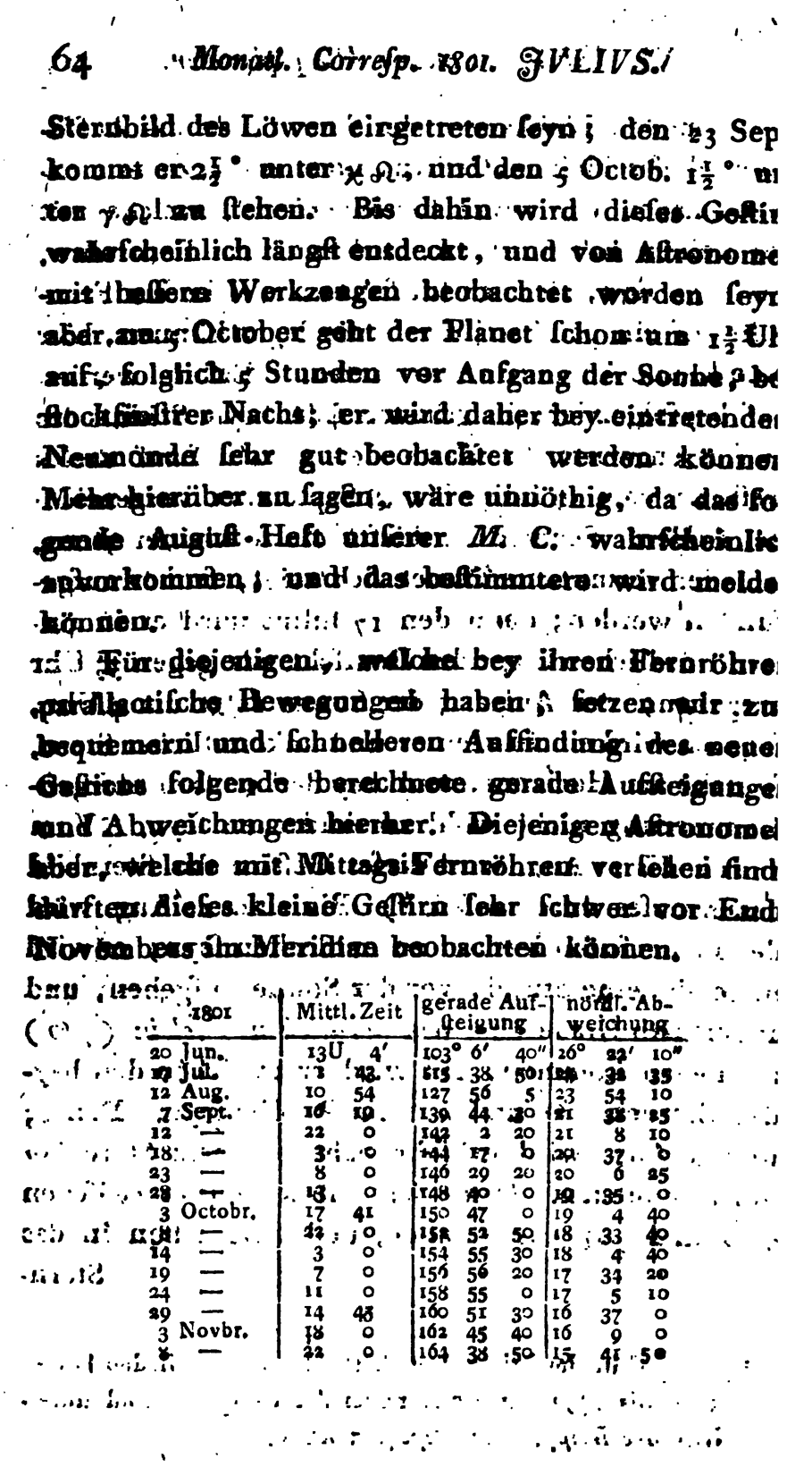 Monatliche Correspondenz zur Beförderung der Erd-und Himmels-Kunde: Fortgesetzte Nachrichten über den zwischen Mars und Jupiter längft vermutheten, nun wahrscheinlich entdeckten neuen Hauptplaneten unseres Sonnen-Systems, Gotha Luglio 1801 |
