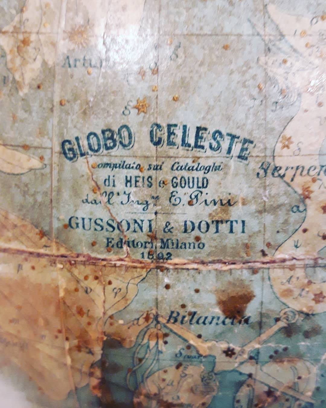 Il globo celeste del 1892 del diametro di 22 centimetri venne prodotto in coppia con quello terrestre dall’editore GUSSONI & DOTTI: Giovanni Gussoni nel 1874 aveva acquistato l’attività del tipografo Antonio Ronchi in Via Unione 5 a Milano, per poi trasferirsi nel 1883 nel negozio dei Portici Meridionali di piazza Duomo. A Giovanni Gussoni seguì il figlio Vittorio, che il 16 aprile 1907 cedette la ditta a un collaboratore, Giovanni Serra, che proseguì l'attività fino al novembre del 1914.