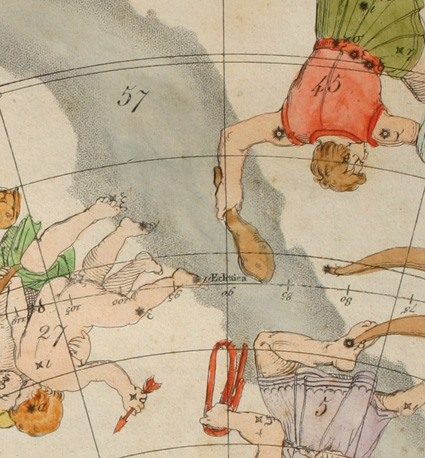 E’ evidenziato il polo nord eclittico per il quale passa l’unico cerchio di longitudine che venga disegnato sulla mappa, quello che unisce e si prolunga oltre i due punti equinoziali fino alla declinazione di -45°.